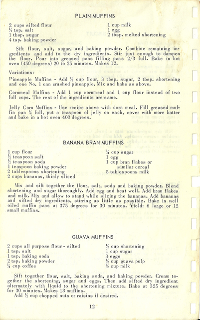 Pineapple Muffins – Add 1/2 cup flour, 3 tbsp. sugar, 2 tbsp. shortening and one No. 1 can crushed pineapple. Mix and bake as above.