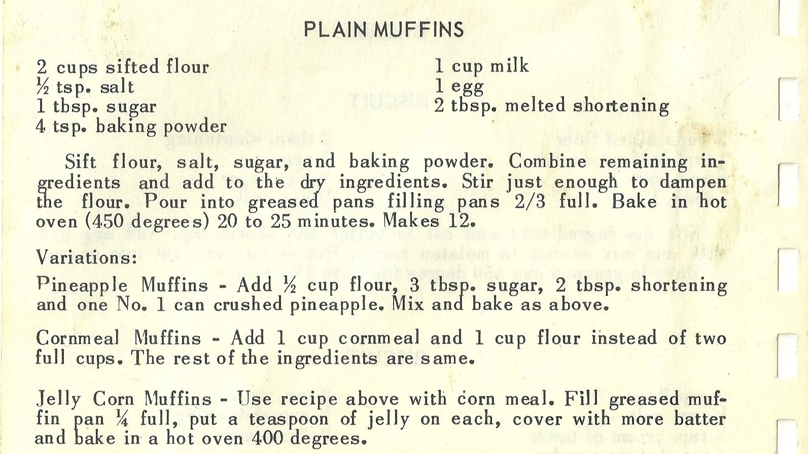 Jelly Corn Muffins – Use recipe above with Corn meal. Fill greased mufÂfin pan 1/4 full, put a teaspoon of jelly on each, cover with more batter and bake in a hot oven 400 degrees.