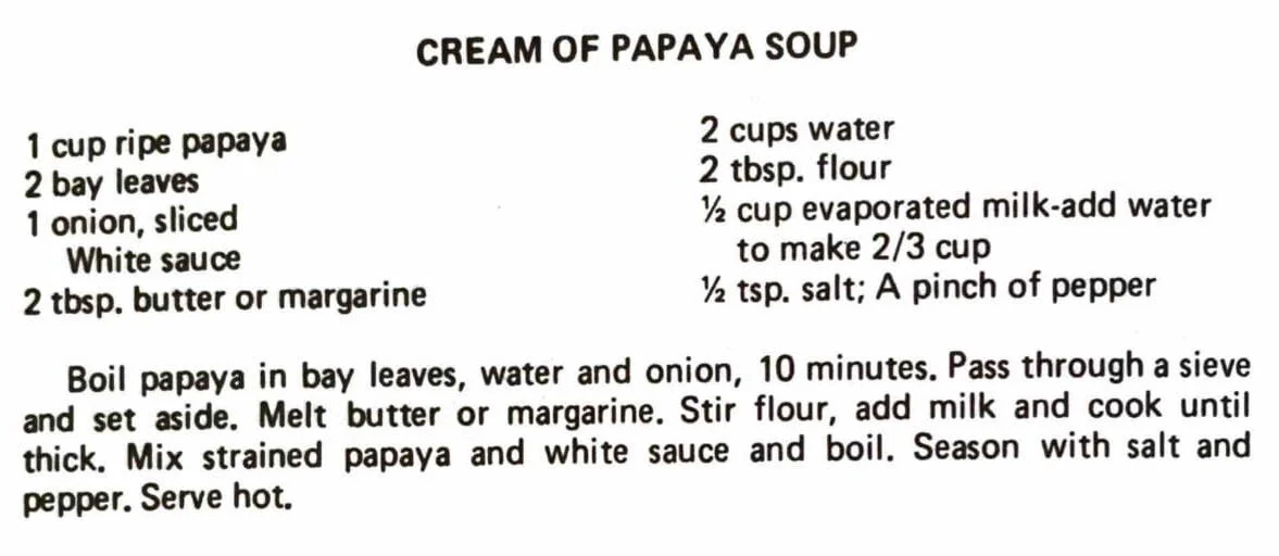 Boil papaya in bay leaves, water and onion, 10 minutes. Pass through a sieve and set aside. Melt butter or margarine. Stir flour, add milk and cook until thick. Mix strained papaya and white sauce and boil. Season with salt and pepper. Serve hot.