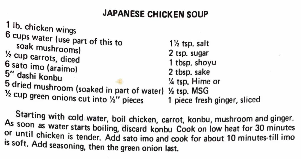 Starting with cold water, boil chicken, carrot, konbu, mushroom and ginger. As soon as water starts boiling, discard konbu. Cook on low heat for 30 minutes or until chicken is tender. Add sato imo and cook for about 10 minutes – till imo is soft. Add seasoning, then the green onion last.