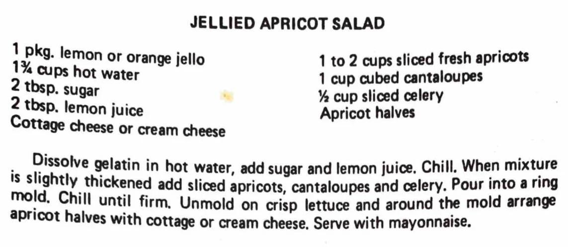 Dissolve gelatin in hot water, add sugar and lemon juice. Chill. When mixture is slightly thickened add slice apricots, cantaloupes and celery. Pour into a ring mold. Chill until firm. Unmold on crisp lettuce and around the mold arrange apricot halves with cottage or cream cheese. Serve with mayonnaise.