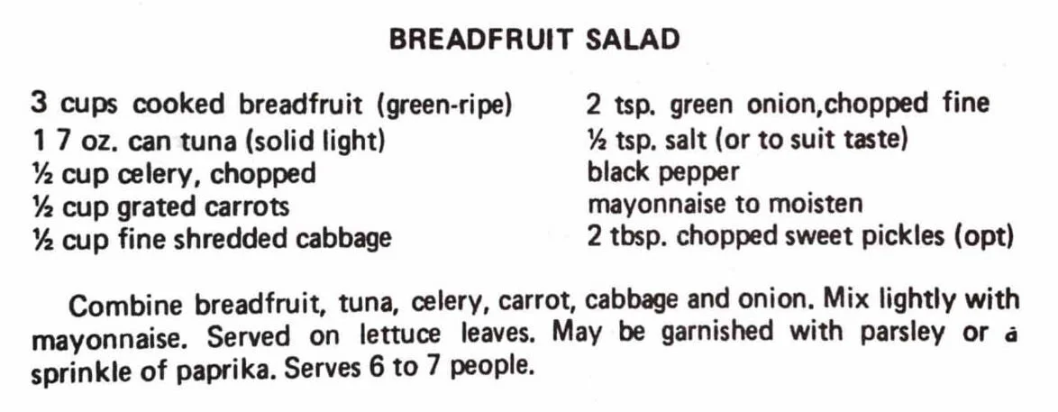 Combine breadfruit, tuna, celery, carrot, cabbage and onion. Mix lightly with mayonnaise. Served on lettuce leaves. May be garnished with parsley or a sprinkle of paprika. Serves 6 to 7 people.