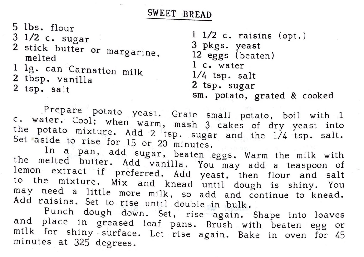 In a pan, add sugar, beaten eggs. Warm the milk with the melted butter. Add vanilla. You may add a teaspoon of lemon extract if to the mixture. Mix and Mine erred preferred. Add yeast, then flour and salt knead until dough is shiny. You may need a little more milk, so add and continue to knead. Add raisins. Set to rise until double in bulk.