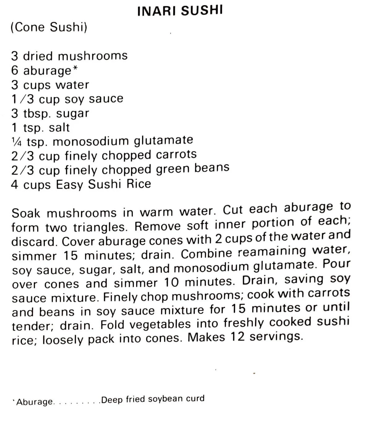 Soak mushrooms in warm water. Cut each aburage to form two triangles. Remove soft inner portion of each; discard. Cover aburage cones with 2 cups of the water and simmer 15 minutes; drain. Combine remaining water, soy sauce, sugar, salt, and monosodium glutamate. Pour over cones and simmer 10 minutes. Drain, saving soy sauce mixture. Finely chop mushrooms; cook with carrots and beans in soy sauce mixture for 15 minutes or until tender; drain. Fold vegetables into freshly cooked sushi rice; loosely pack into cones. Makes 12 servings.