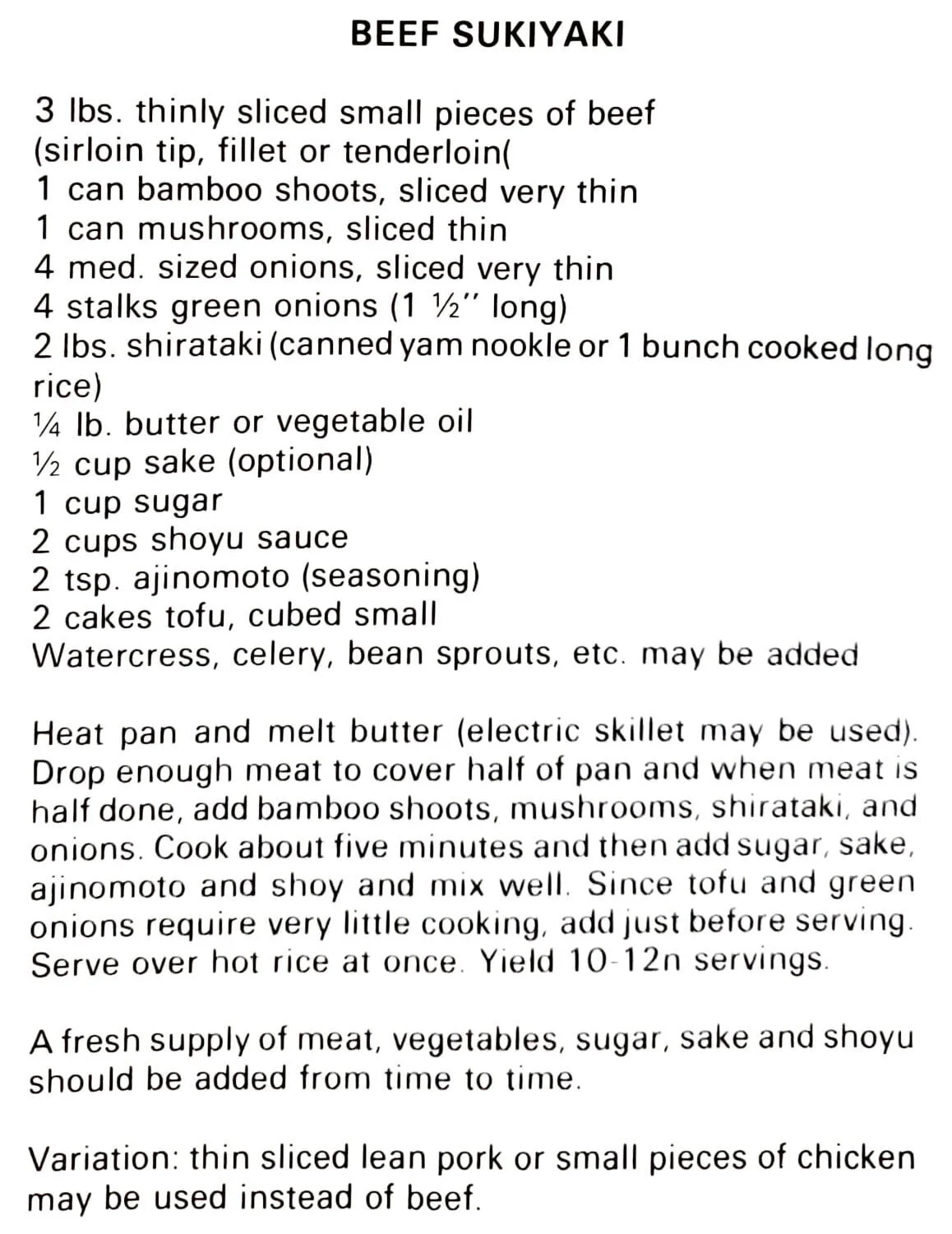 Heat pan and melt butter (electric skillet may be used). Drop enough meat to cover half of pan and when meat is half done, add bamboo shoots, mushrooms, shirataki, and onions. Cook about five minutes and then add sugar, sake, ajinomoto and shoyu and mix well. Since tofu and green onions require very little cooking, add just before serving. Serve over hot rice at once. Yield 10 – 12n servings.