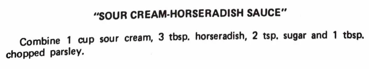 Combine 1 cup sour cream, 3 tbsp. horseradish, 2 tsp. sugar and 1 tbsp. chopped parsley.