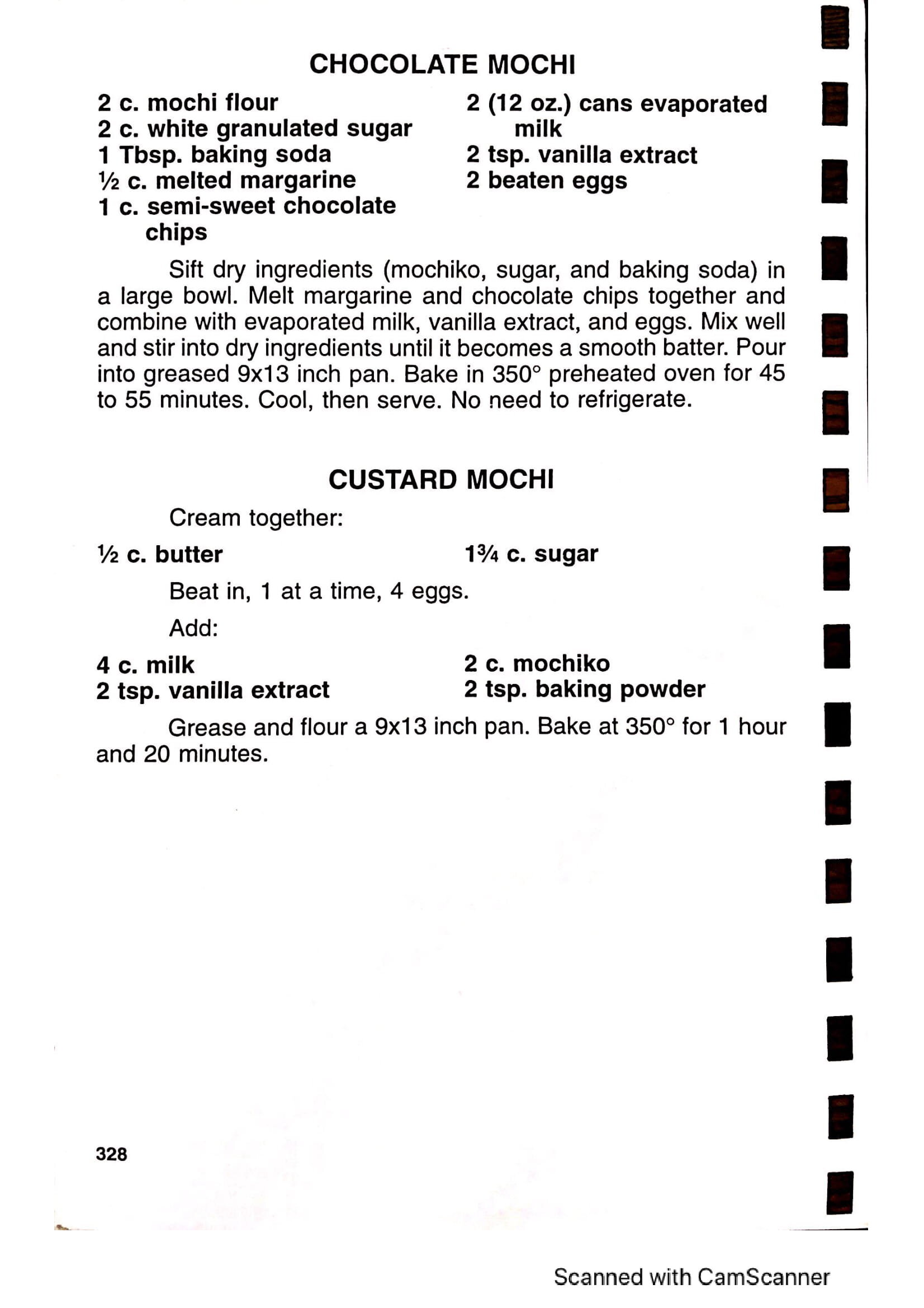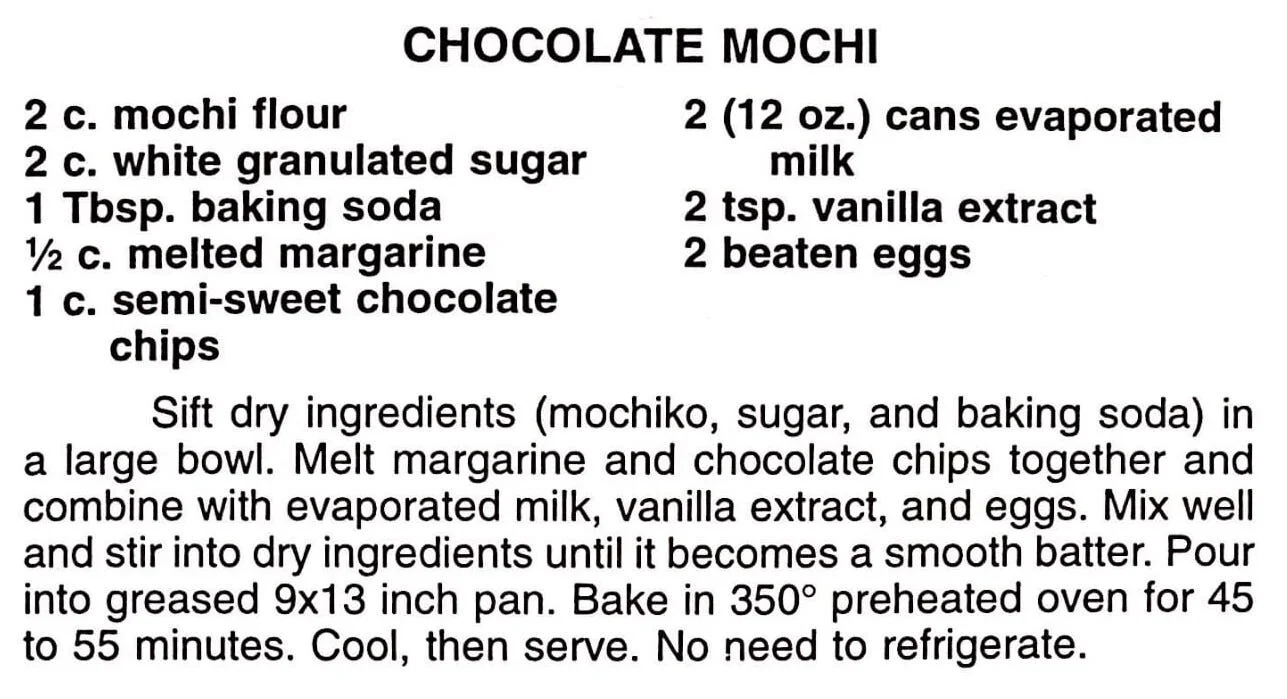 Sift dry ingredients (mochiko, sugar, and baking soda) in a large bowl. Melt margarine and chocolate chips together and combine with evaporated milk, vanilla extract, and eggs. Mix well and stir into dry ingredients until it becomes a smooth batter. Pour into greased 9×13 inch pan. Bake in 350 F. preheated oven for 45 to 55 minutes. Cool, then serve. No need to refrigerate.