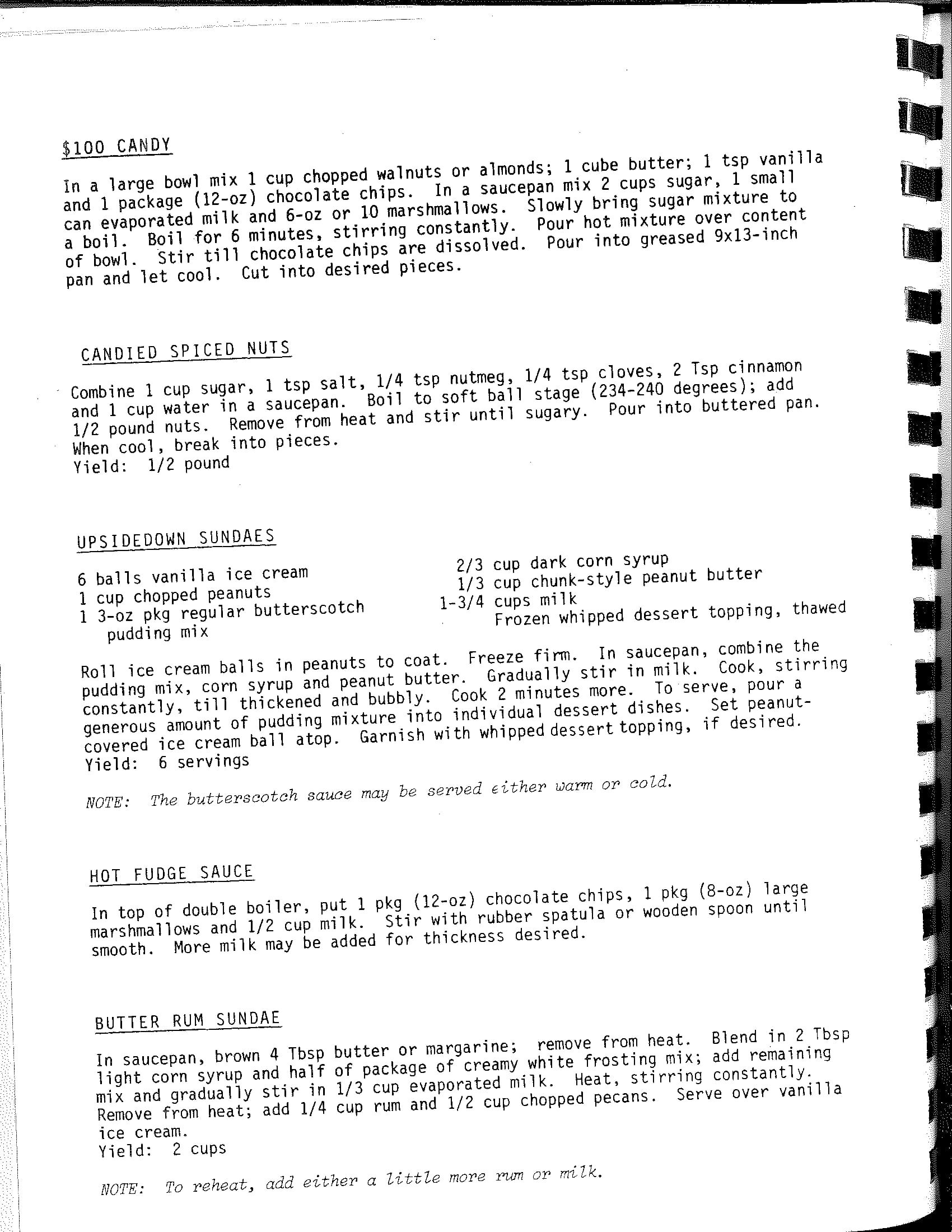 1 8-ounce can nuts (walnuts or pecans) 1 cup water 2 tbsp. white corn syrup 12 marshmallows cut in small pieces 1/4 tsp. salt 2 cups sugar 2 or 3 drops peppermint flavoring (according to strength desired) Mix sugar, water, syrup and salt. Stir until sugar is dissolved. Cook to soft ball stage. Remove from…