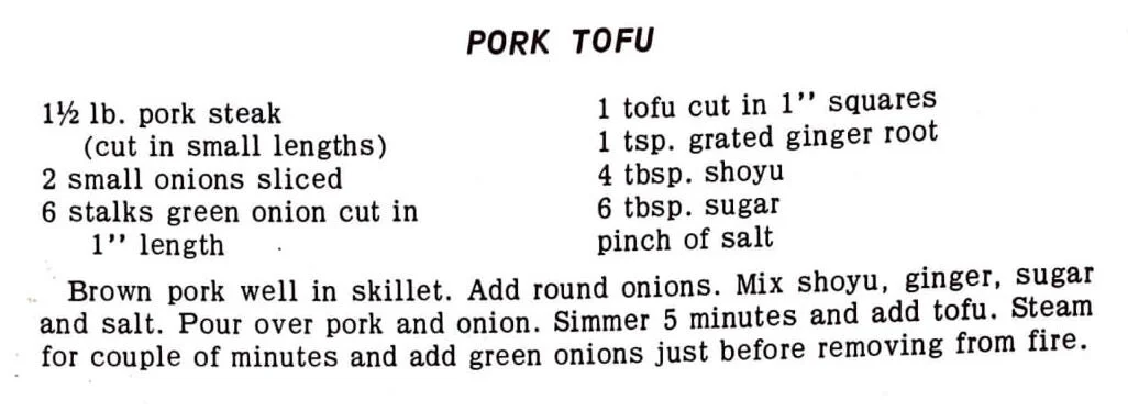 SERVES: 6 1-1/2 lb. belly or shoulder pork 1 block tofu 1 large daikon 1 bunch mustard cabbage 2-1/2 cups pork stock oil for frying Seasonings: 1/4 cup shoyu 2 tsp. sugar dash msg Cover and parboil pork for 30 minutes. Cut tofu into 2 x 1/2 x 1/2 inch sizes. Place on clean dishcloth…