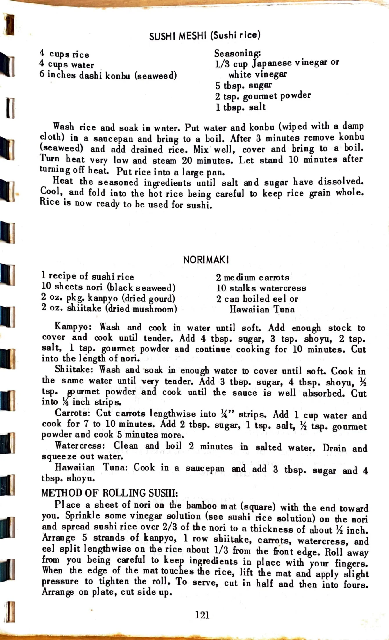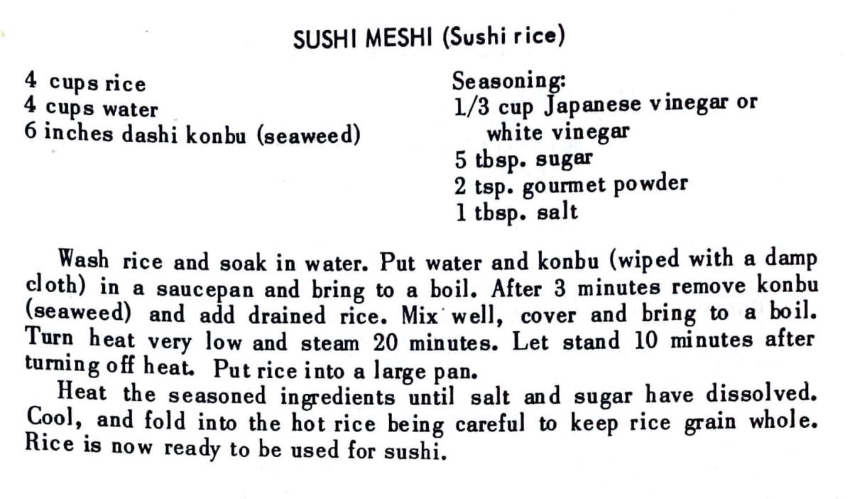 3 cups rice3 cups water When steamed and ready, mix in the following:1/2 konnyaku (made from flour of tuber root)1 small carrot6 string beans6 dried mushrooms soaked in water1/3 kamaboko1 aburage (fried bean curd)1 small gobo (burdock) seasoning:2 tbsp. shrimp flakes3-1/2 tbsp. sboyu3-1/2 tbsp. sugar1-1/2 tsp. salt1/2 tsp. gourmet powder Cut all ingredients into small…
