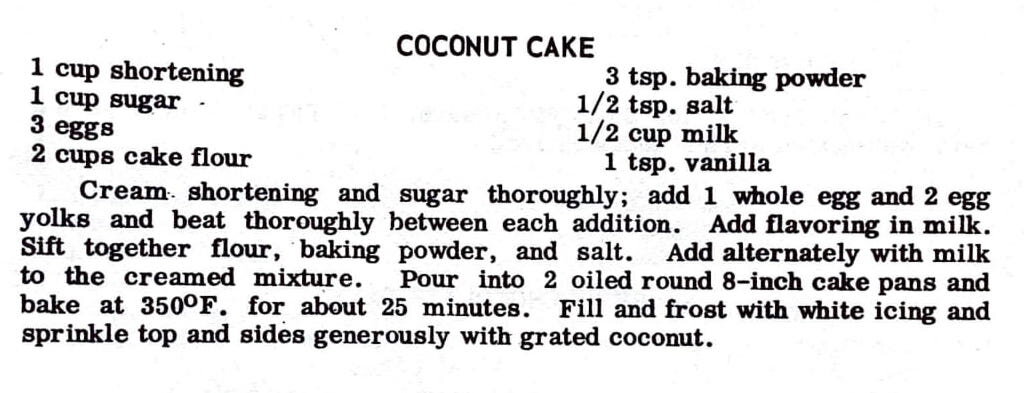 Cream shortening and sugar thoroughly; add 1 whole egg and 2 egg yolks and beat thoroughly between each addition. Add flavoring in milk. Sift together fiour, baking powder, and salt. Add alternately with milk to the creamed mixture. Pour into 2 oiled round 8-inch cake pans and bake at 350 F. for about 25 minutes. Fill and frost with white icing and sprinkle top and sides generously with grated coconut.