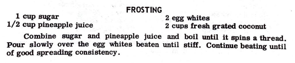 Combine sugar and pineapple juice and boil until it spins a thread. Pour slowly over the egg whites beaten until stiff. Continue beating until of good spreading consistency.