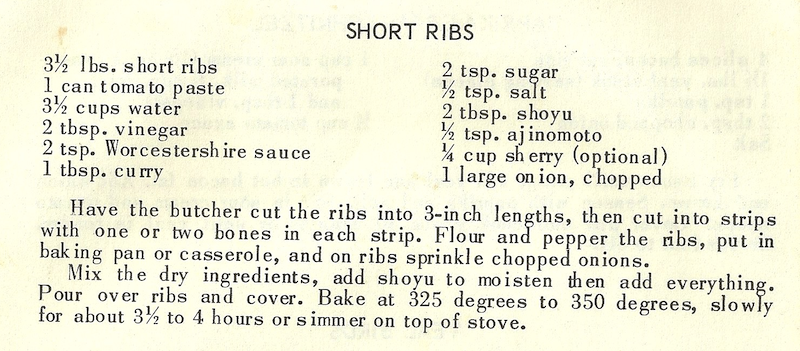 Have the butcher cut the ribs into 3 inch length, then cut into strips with one or two bones in each strip. Flour and pepper the ribs, put in baking pan or casserole, and on ribs sprinkle chopped onions. Mix the dry ingredients, add shoyu to moisten then add everything. Pour over ribs and cover. Bake at 325 to 350 F, slowly for about 3-1/2 to 4 hours or simmer on top of stove.