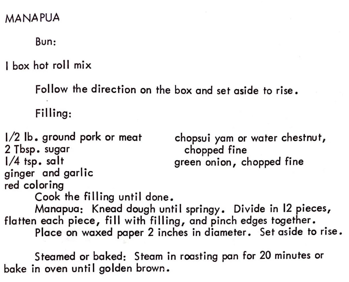 Manapua: Knead dough until springy. Divide in 12 pieces, flatten each piece, till with fi l l i n g , and pinch edges together.