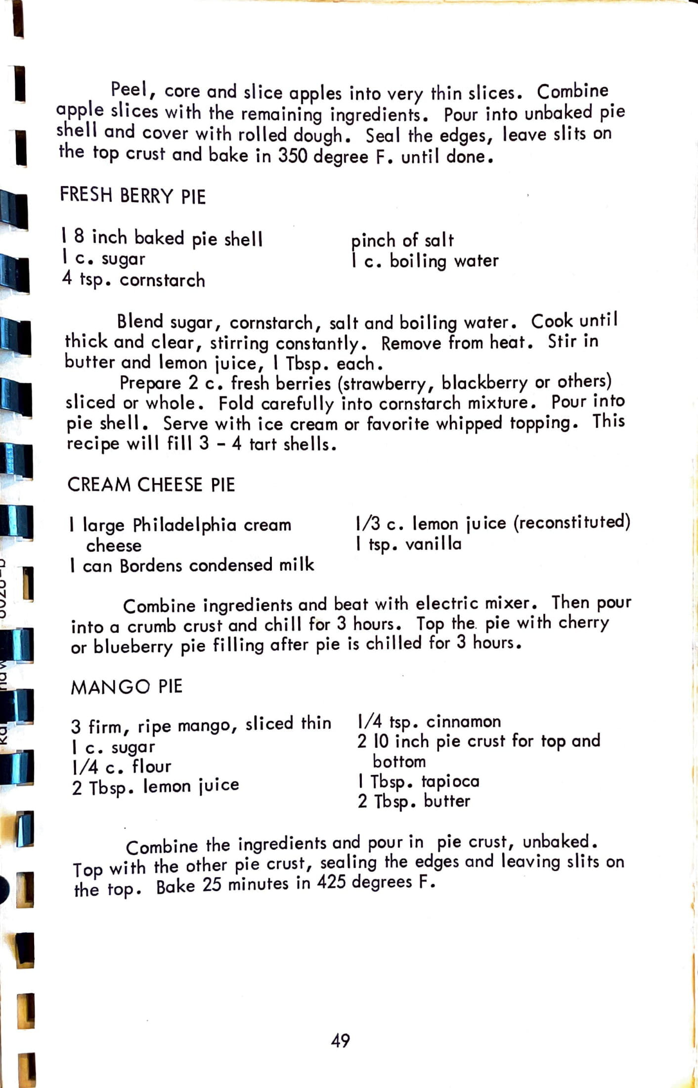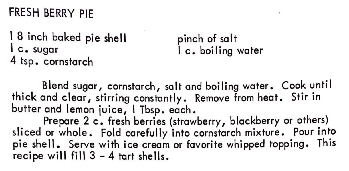 4 cups berries3/4 to 1 cup sugar2 tbsp. flour2 tbsp. minute topioca1 tbsp. lemon juice1/2 tsp. cinnamon1/4 tsp. salt1/4 tsp. nutmeg1 tbsp. butter Sprinkle these ingredients over the berries and stir them gently until they are well blended. Pour them into pie crust. Dot them with butter, cover with top crust. Make several slits with…