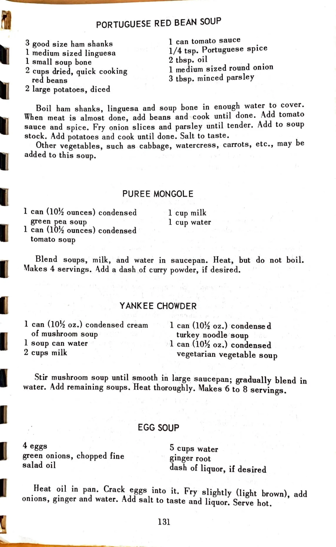 2-1/2 to 3 lbs. stewing chicken cut in pieces 1 bundle long rice, soaked in hot water and cut into 3-4″ lengths 2 tbsp. oil 1 tbsp. salt 1 clove garlic Dash of pepper 1 inch piece ginger 1 tbsp. shoyu 4 cups water 1 tbsp. ajinomoto 1 stalk green onion 2 eggs Fry garlic…