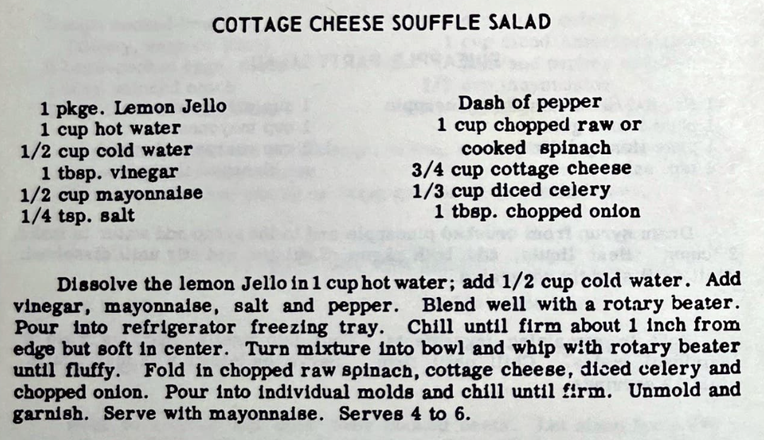 Dissolve the lemon Jello In 1 cup hot water; add 1/2 cup cold water. Add vinegar, mayonnaise, salt and pepper. Blend well with a rotary beater.Pour into refrigerator freezing tray. Chill until firm about 1 Inch from edge but soft in center. Turn mixture into bowl and whip with rotary beater until fluffy. Fold In chopped raw spinach, cottage cheese, diced celery and chopped onion. Pour into individual molds and chill until firm. Unmold and garnish. Serve with mayonnaise. Serves 4 to 6.