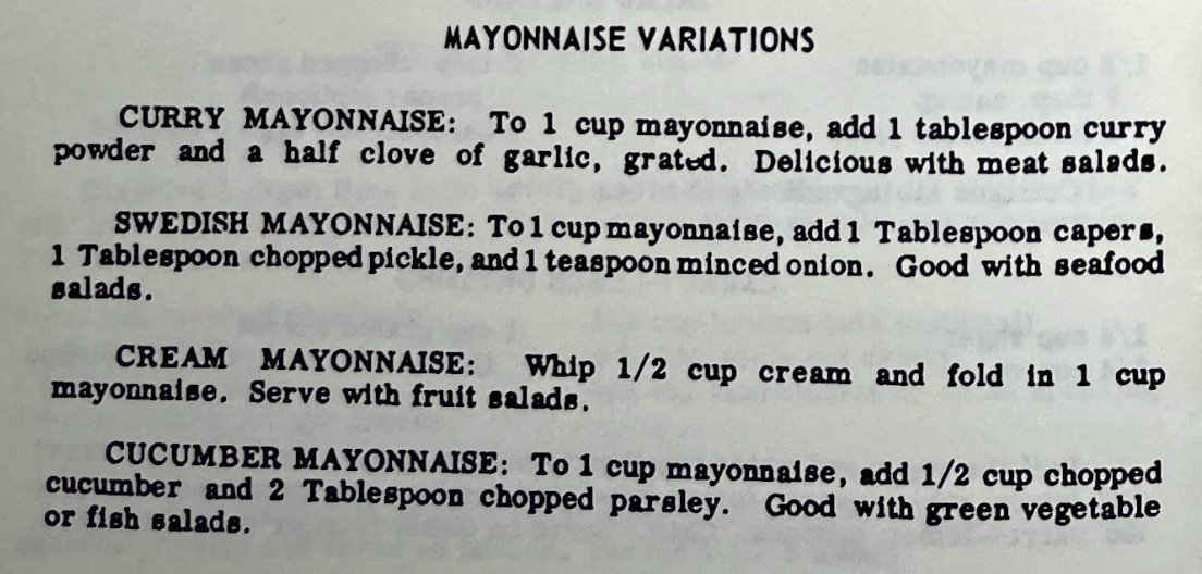 SWEDISH MAYONNAISE: To 1 cup mayonnaise, add 1 Tablespoon capers, 1 Tablespoon chopped pickle, and 1 teaspoon minced onion. Good with seafood salads.