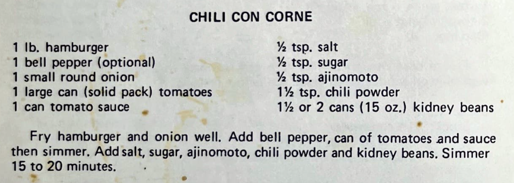 Fry hamburger and onion well. Add bell pepper, can of tomatoes .and sauce then simmer. Add salt, sugar, ajinomoto, chili powder and kidney beans. Simmer 15 to 20 minutes.