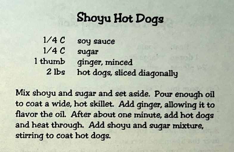 Mix shoyu and sugar and set aside. Pour enough oil to coat a wide, hot skillet. Add ginger, allowing it to flavor the oil. After about one minute, add hot dogs and heat through. Add shoyu and sugar mixture, stirring to coat hot dogs.