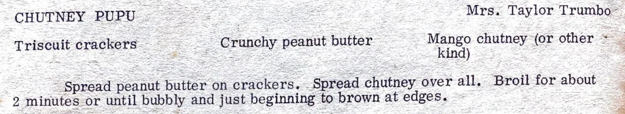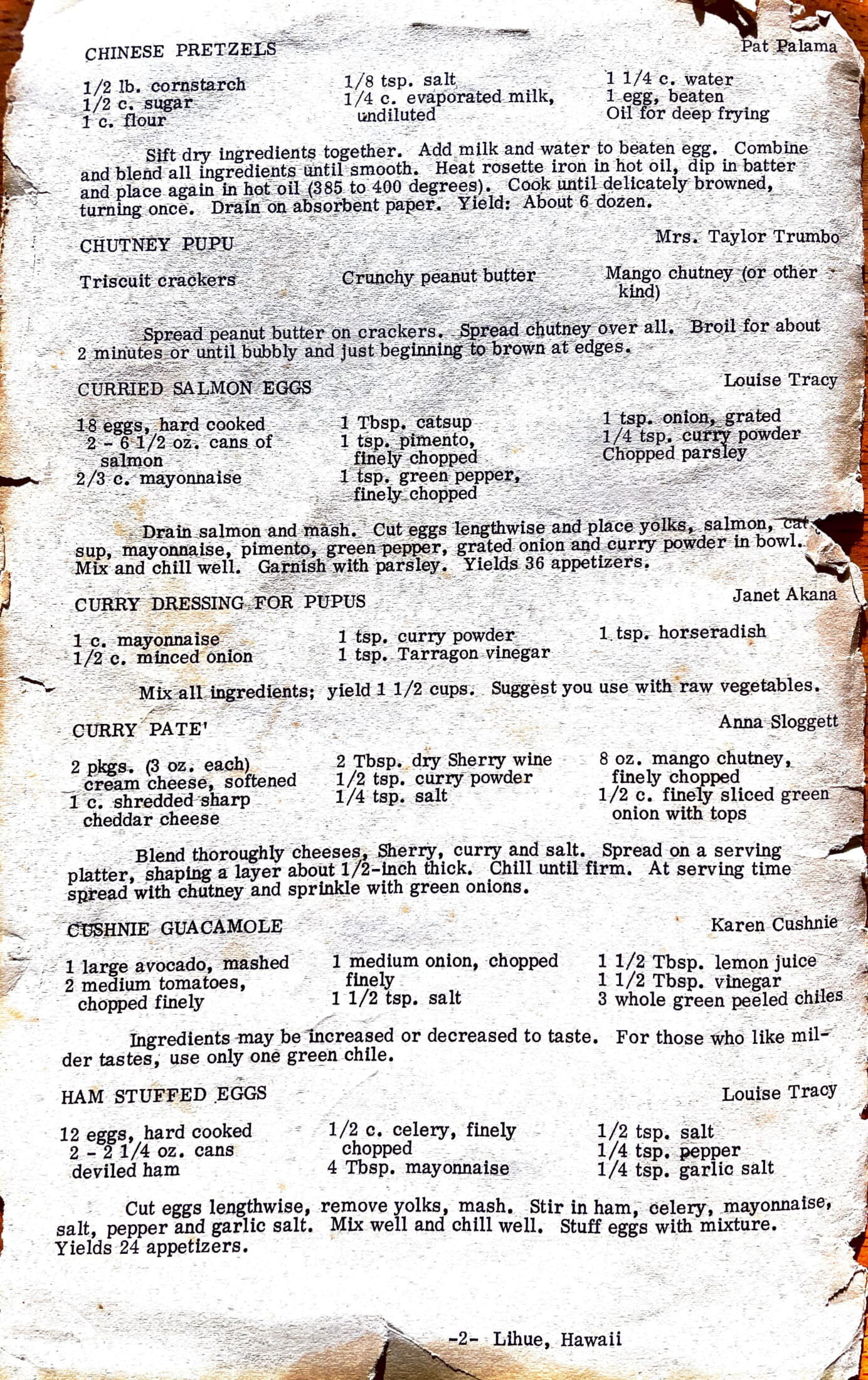 3/4 c flour 1/2 t salt 1 t sugar 1/4 c water 1 kamaboko, grated 6 medium shrimp, chopped 1c water chestnuts, chopped green onion, chopped Combine dry ingredients, add water and stir only to moisten dry ingredients. Add kamaboko, shrimp, water chestnuts and green onions. Drop by teaspoons into heated oil and fry until…