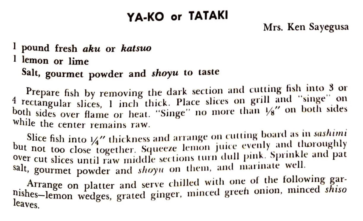 SERVINGS 4 1 lb. raw fish 1 cup shredded lettuce or watercress tips 1/2 teaspoon dry mustard or ginger root 1/2 teaspoon hot water 1/2 cup shoyu Use fish which has no small bones in the flesh, such as tuna, ahi, swordfish, ulua or uku. Remove skin and the dark portion. Using a sharp, long…