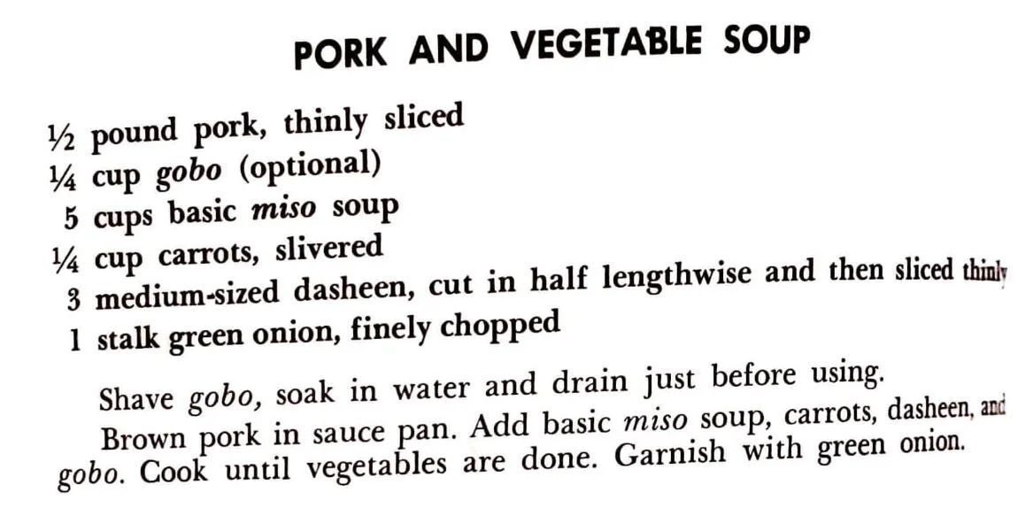 1/4 lb. beef (chuck) 2 stalks green onion 1 clove garlic, chopped 1 tbsp. sesame seeds, prepared 4 tbsp. shoyu 1/4 tsp. MSG 1 tsp. salt Pepper 1 pkg. frozen chopped spinach (10 oz. pkg.) thawed 6 cups water Cut beef into thin slices 1 inch square. Add chopped onions, garlic, prepared sesame seeds, soy…