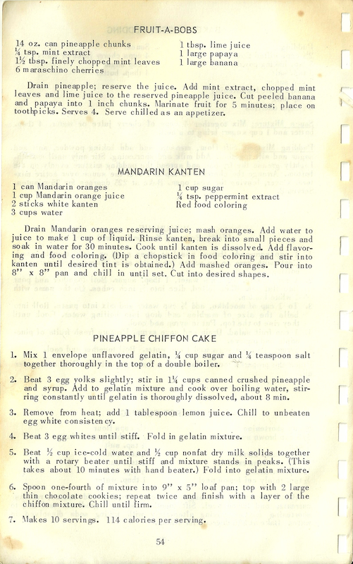 1/2 cup orange juice 1/4 cup lemon juice 1 cup pineapple juice Ice, crushed 1/4 cup water 1/4 cup sugar 1 pint (2 cups) gingerale Stir juices, water and sugar together in pitcher until sugar is disĀsolved. Just before serving add gingerale. Pour over cracked, ice which has been placed in glasses. YIELD: 5 ordinary…