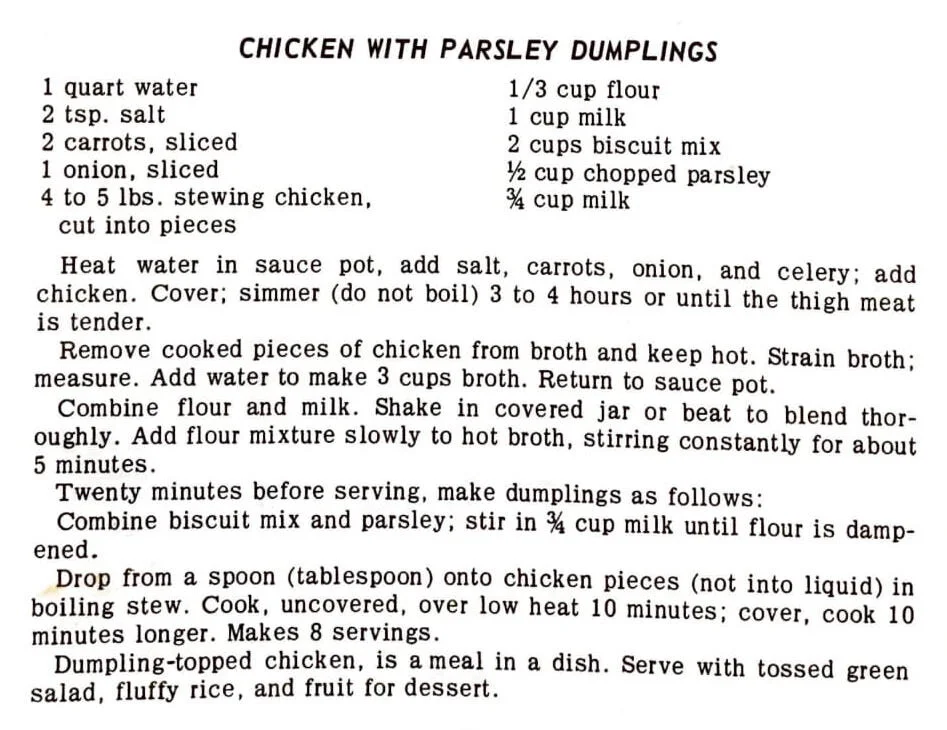 1 lb. hamburger1 medium sized round onion1 #2 can peas and carrots1 to 2 tbsp. curry powdersalt and pepper2 cups water Fry onion in 1 tbsp. oil until onion clears. Add hamburger and fry until evenly browned. Add water and can of peas and carrots. Bring to a boil. Add curry powder, salt and pepper…