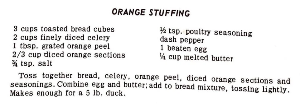 Toss together bread, celery, orange peel, diced orange sections and seasonings. Combine egg and butter; add to bread mixture, tossing lightly. Makes enough for a 5 lb. duck.
