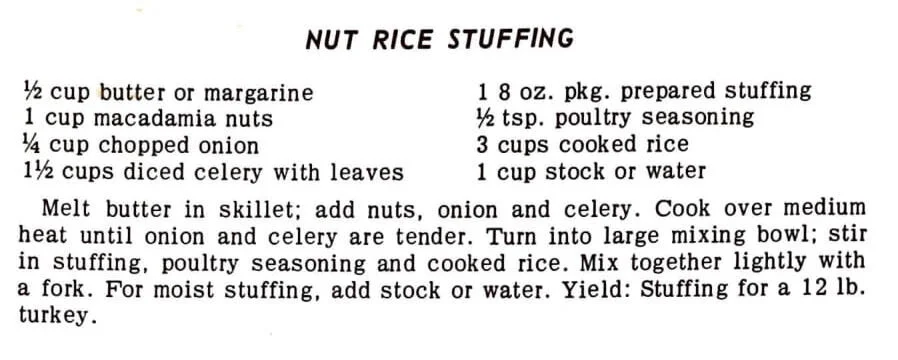 Melt butter in skillet; add nuts, onion and celery. Cook over medium heat until onion and celery are tender. Turn into large mixing bowl; stir in stuffing, poultry seasoning and cooked rice. Mix together lightly with a fork. For moist stuffing, add stock or water. Yield: Stuffing for a 12 lb. turkey.