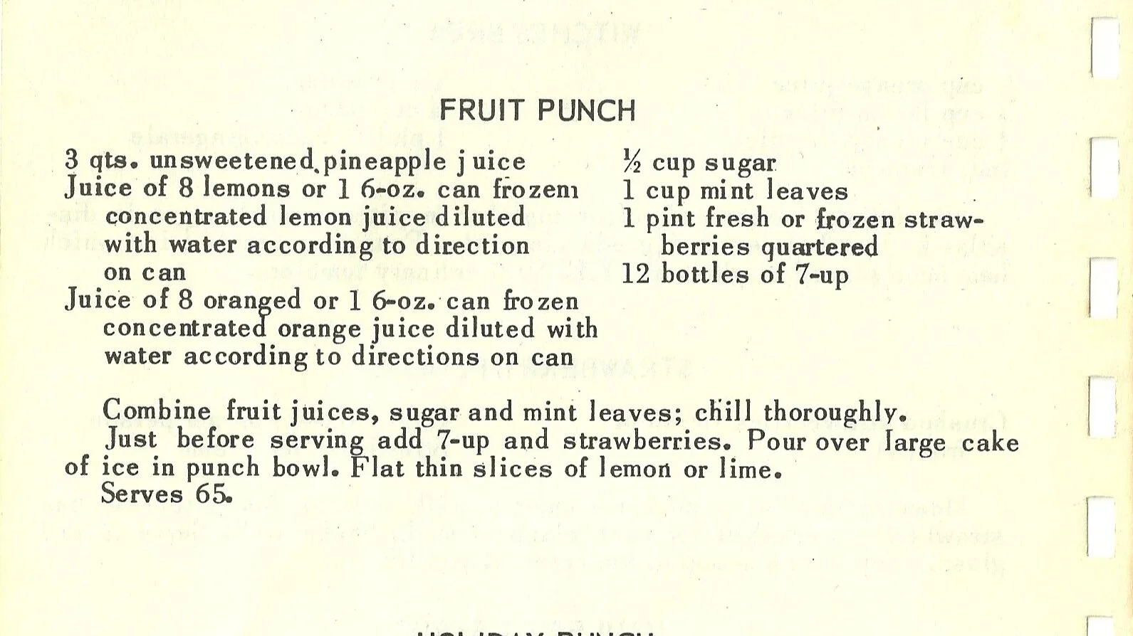 Combine fruit juices, sugar and mint leaves; chill thoroughly. Just before serving add 7-up and strawberries. Pour over large of ice in punch bowl. Flat thin slices of lemon or lime.
