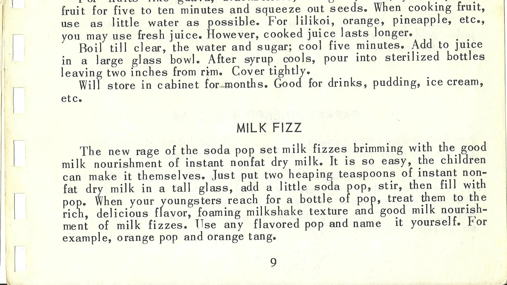 The new rage of the soda pop set milk fizzes brimming with the good milk nourishment of instant nonfat dry milk. It is so easy, the children can make it themselves. Just put two heaping teaspoons of instant nonfat dry milk in a tall glass, add a little soda pop, stir, then fill with pop. When your youngsters reach for a bottle of pop, treat them to the rich, delicious flavor, foaming milkshake texture and good milk nourishment of milk fizzes. -Use any flavored pop and name it yourself. For example, orange pop and orange tang.