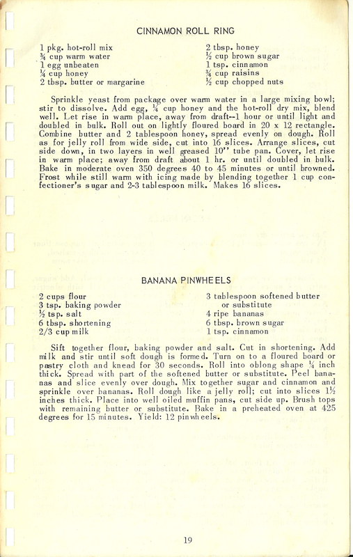 Sift together flour, baking powder and salt. Cut in shortening. Add milk and stir until soft dough is formed. Turn on to a floured board or pastry cloth and knead for 30 seconds. Roll into oblong shape 1/4 inch thick. Spread with part of the softened butter or substitute. Peel bananas and slice evenly over dough. Mix together sugar and cinnamon and sprinkle over bananas. Roll dough like a jelly roll; cut into slices 1-1/2 inches thick. Place into well oiled muffin pans, cut side up. Brush tops with remaining butter or substitute. Bake in a preheated oven at 425 degrees for 15 minutes. Yield: 12 pinwheels.