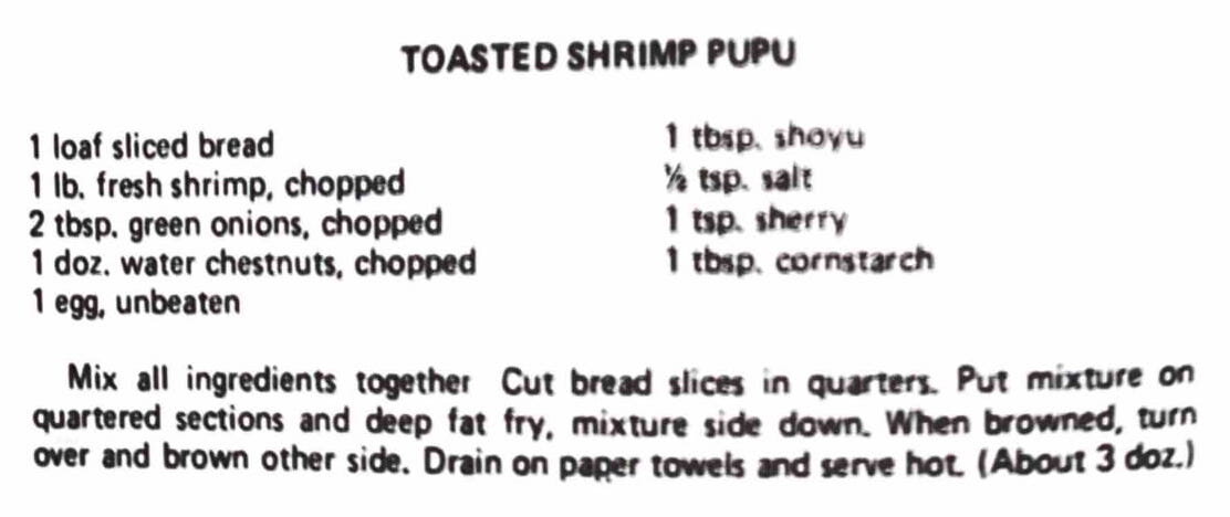 Mix all ingredients together. Cut bread slices in quarters. Put mixture on quartered sections and deep fat fry, mixture side down. When browned, turn over and brown other side. Drain on paper towels and serve hot. (About 3 doz.)
