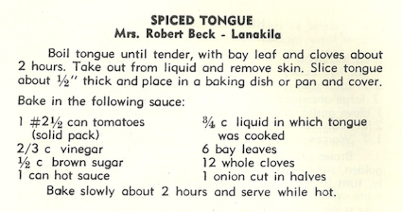 Boil tongue until tender, with bay leaf and cloves about 2 hours. Take out from liquid and remove skin. Slice tongue about 1/2” thick and place in a baking dish or pan and cover.