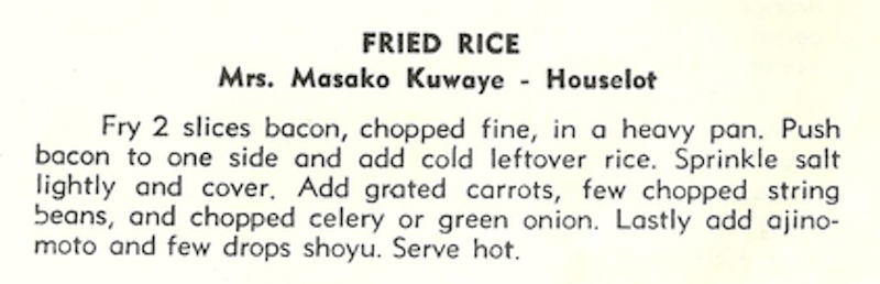 1 tbsp. shoyu2 cup cooked rice1 cup raw ham, cooked and diced1 cup Chinese sausage3 eggs scrambled3 stalks green onion Heat pan and fry sausage, ham over medium fire for 5 minutes. Add salt and shoyu. Add rice and cook for 5 minutes. Add onion and scrambled eggs.