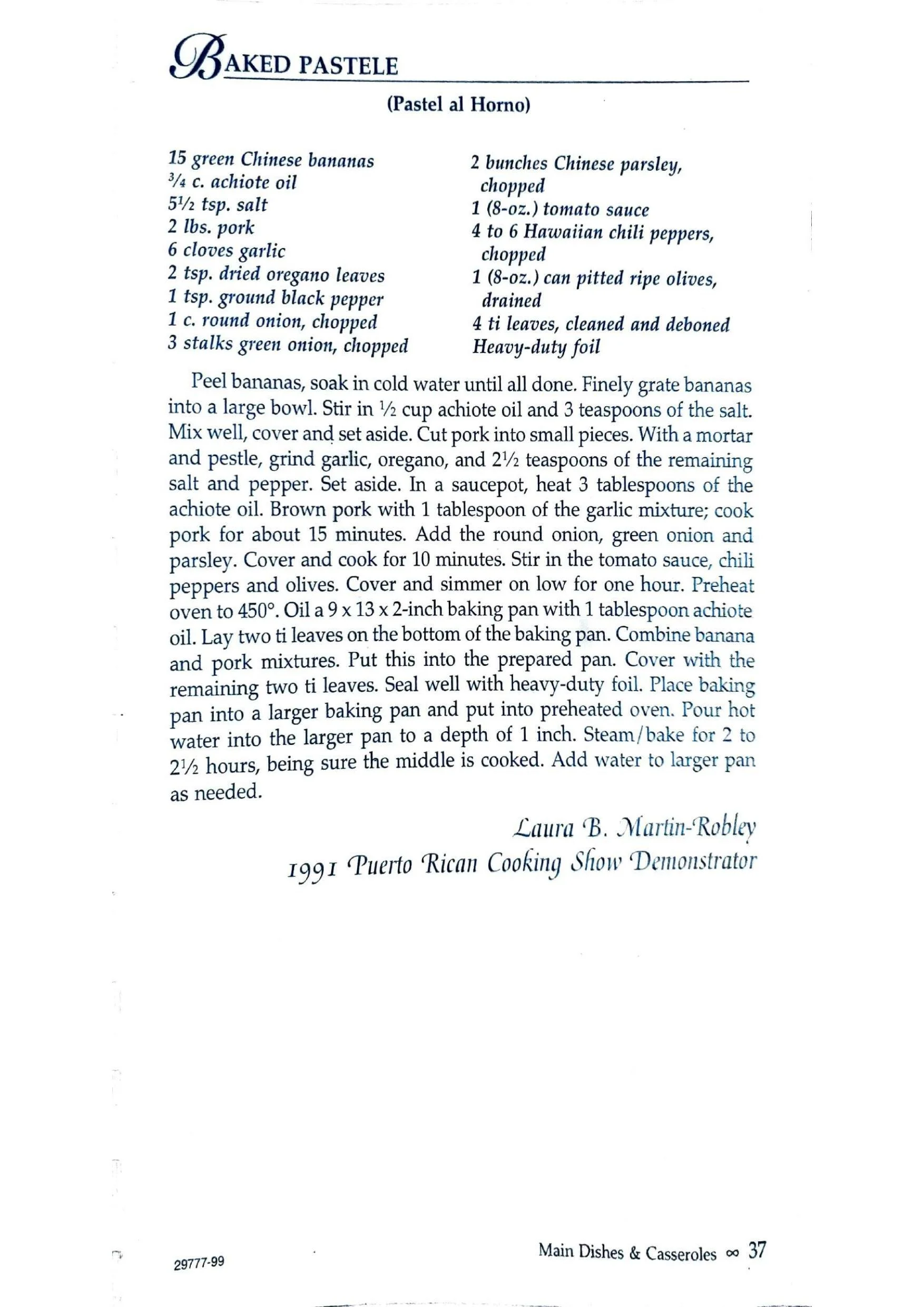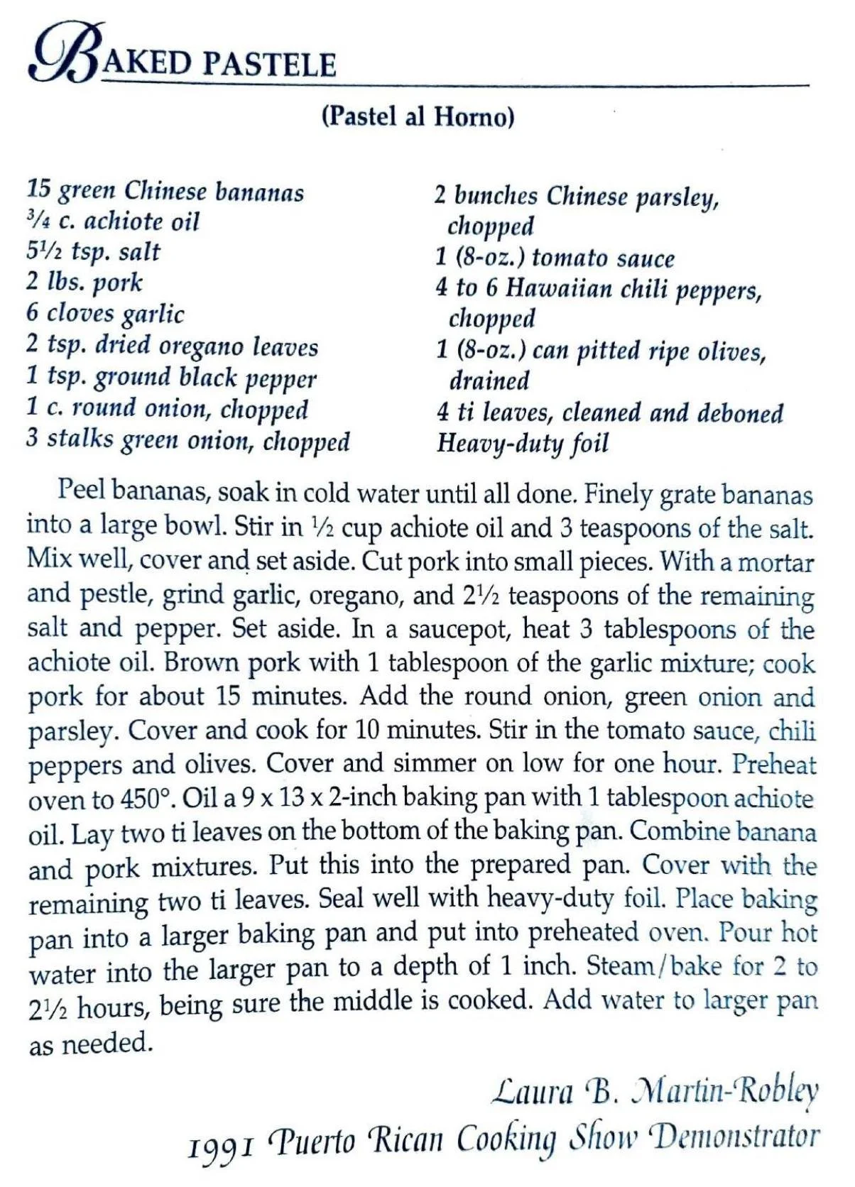 Peel bananas, soak in cold water until all done. Finely grate bananas into a large bowl. Stir in 1/2 cup achiote oil and 3 teaspoons of the salt. Mix well, cover and set aside. Cut pork into small pieces. With a mortar and pestle, grind garlic, oregano, and 21/2 teaspoons of the remaining salt and pepper. Set aside. In a saucepot, heat 3 tablespoons of the achiote oil. Brown pork with 1 tablespoon of the garlic mixture; cook pork for about 15 minutes. Add the round onion, green onion and parsley. Cover and cook for 10 minutes. Stir in the tomato sauce, chili peppers and olives. Cover and simmer on low for one hour. Preheat oven to 4500. Oil a 9 x 13 x 2-inch baking pan with 1 tablespoon achiote oil. Lay two ti leaves on the bottom of the baking pan. Combine banana and pork mixtures. Put this into the prepared pan. Cover with the remaining two ti leaves. Seal well with heavy-duty foil. Place baking pan into a larger baking pan and put into preheated oven. Pour hot water into the larger pan to a depth of 1 inch. Steam/ bake for 2 to 2-1/2 hours, being sure the middle is cooked. Add water to larger pan as needed.