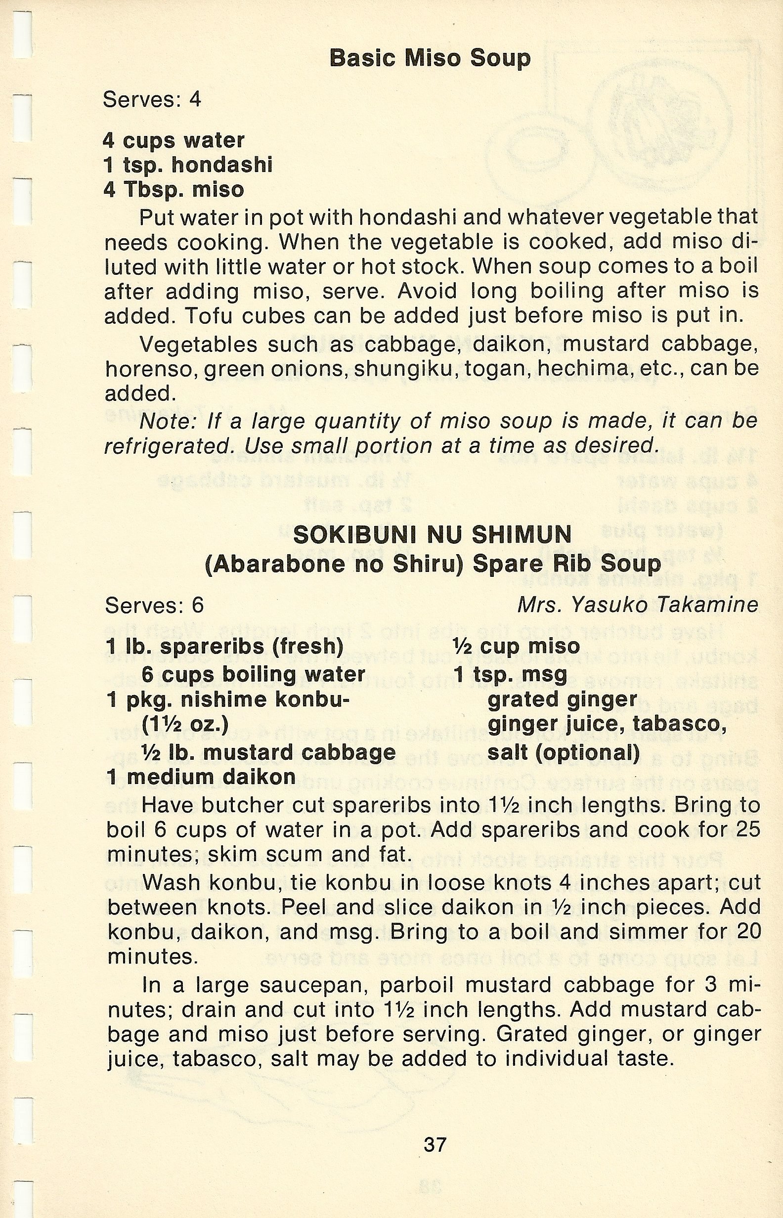 SERVES: 6 1-1/2 lb. belly pork 1-1/2 lb. shoulder pork SEASONINGS: 1 cup pork stock 2 cups dashi (water plus 1/2 tsp. hondashi) 1/2 cup awamori (any liquor may be substituted: bourbon, sake or dry wine) 1/2 cup miso 1/4 cup mirin 1/4 cup brown sugar Boil whole pork for 30 minutes, cool, and cut…