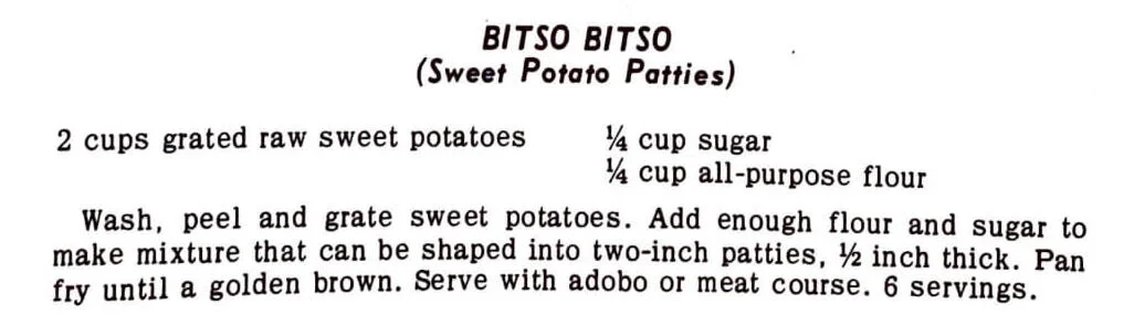 Wash, peel and grate sweet potatoes. Add enough flour and sugar to make mixture that can be shaped into two-inch patties, 1/2 inch thick. Pan fry until a golden brown. Serve with adobo or meat course. 6 servings.