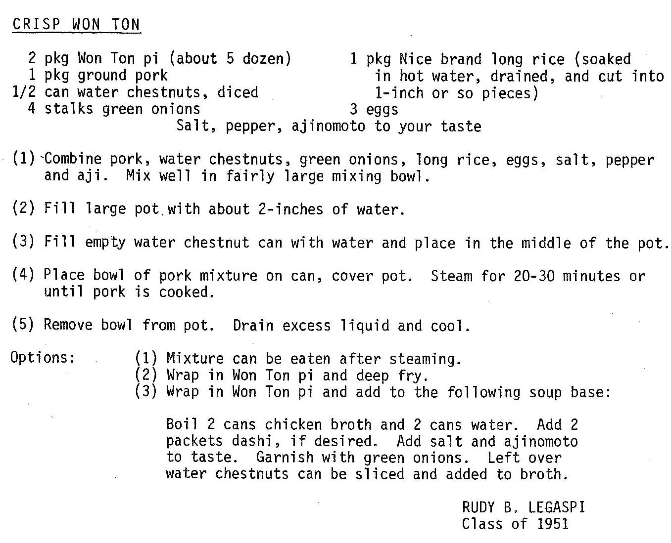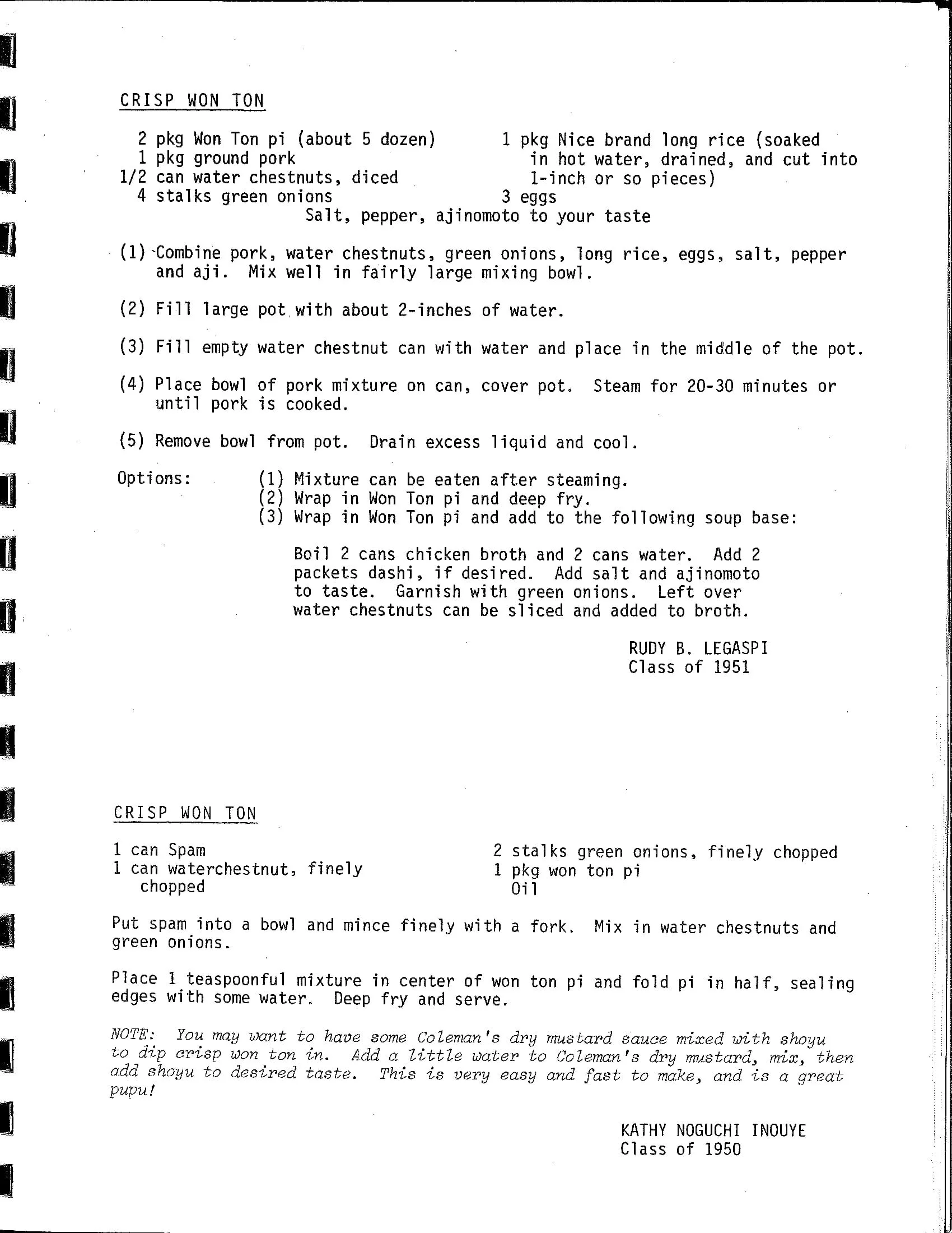 8 oz. fish cake a few chopped water chestnuts 2 small cans deviled meat chopped green onions Do not add seasoning. Mix all ingredients, stuff won ton wrappers, and deep fry. Serve hot.