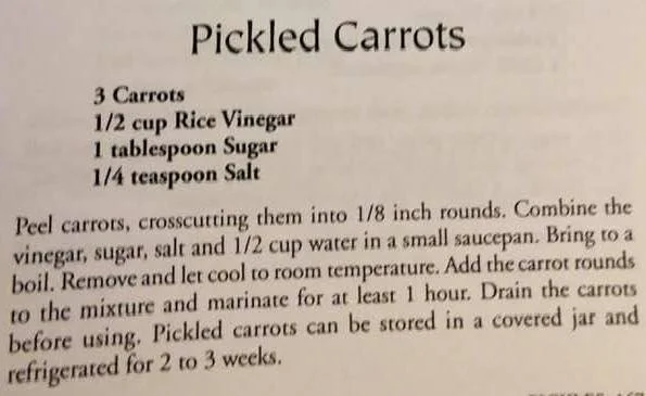 Peel carrots, crosscutting them into 1/8 inch rounds. Combine the vinegar, sugar, salt and 1/2 cup water in a small saucepan. Bring to a boil. Remove and let cool to room temperature. Add the carrot rounds to the mixture and marinate for at least 1 hour. Drain the carrots before using. Pickled carrots can be stored in a covered jar and refrigerated for 2 to 3 weeks.