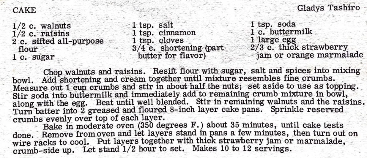 How can you NOT try a cake with “De Luxe” in its name? There is no shortage of prune cake recipes in the Hawai’i cookbooks of this era, and based on the results of this one recipe, I can see why. It is fluffy, moist, and subtly prune-y! The tender bits of chopped cooked prunes throughout add a delightful texture.