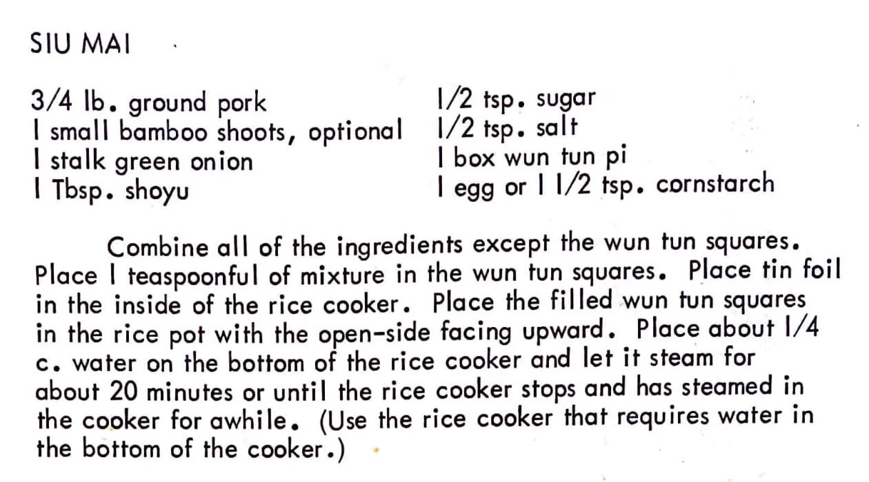 Combine all of the ingredients except the wun tun squares. Place 1 teaspoonful of mixture in the wun tun squares. Place tin foil in the inside of the rice cooker. Place the filled wun tun squares in the rice pot with the open-side facing upward. Place about 1/4 c. water on the bottom of the rice cooker and let it steam for about 20 minutes or until the rice cooker stops and has steamed in the cooker for awhile. (Use the rice cooker that requires water in the bottom of the cooker.)