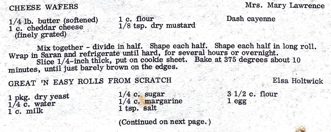 1 cup margarine or butter )1 cup powdered sugar ) ————— Cream together2 tsp. vanilla ) 1-1/2 cup flour )1 cup oatmeal ) ————— Add to mixture, stir1/3 cup shredded coconut ) Shape dough into rolls. Coat each roll in chocolate, cocoa, nuts or colored sugar. Wrap in wax paper and chill. Slice with knife…