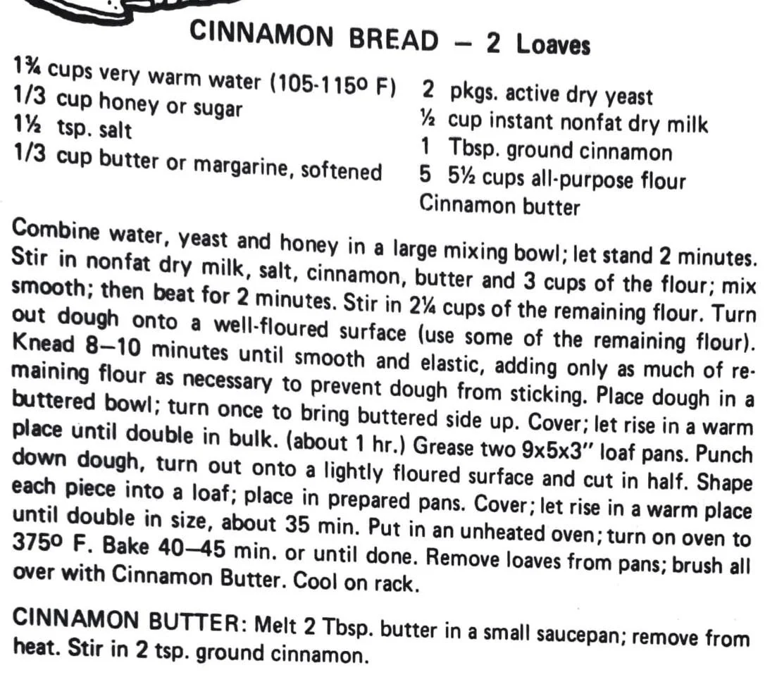 Combine water, yeast and honey in a large mixing bowl; let stand 2 minutes. Stir in nonfat dry milk, salt, cinnamon, butter and 3 cups of the flour; mix smooth; then beat for 2 minutes. Stir in 2-1/4 cups of the remaining flour. Turn out dough onto a well-floured surface (use some of the remaining flour). Knead 8-10 minutes until smooth and elastic, adding only as much of remaining flour as necessary to prevent dough from sticking. Place dough in a buttered bowl; turn once to bring buttered side up. Cover; let rise in a warm place until double in bulk. (about 1 hr.) Grease two 9x5x3” loaf pans. Punch down dough, turn out onto a lightly floured surface and cut in half. Shape each piece into a loaf; place in prepared pans. Cover; let rise in a warm place until double in size, about 35 min. Put in an unheated oven; turn on oven to 375° F. Bake 40-45 min. or until done. Remove loaves from pans; brush all over Cinnamon Butter. Cool on rack.