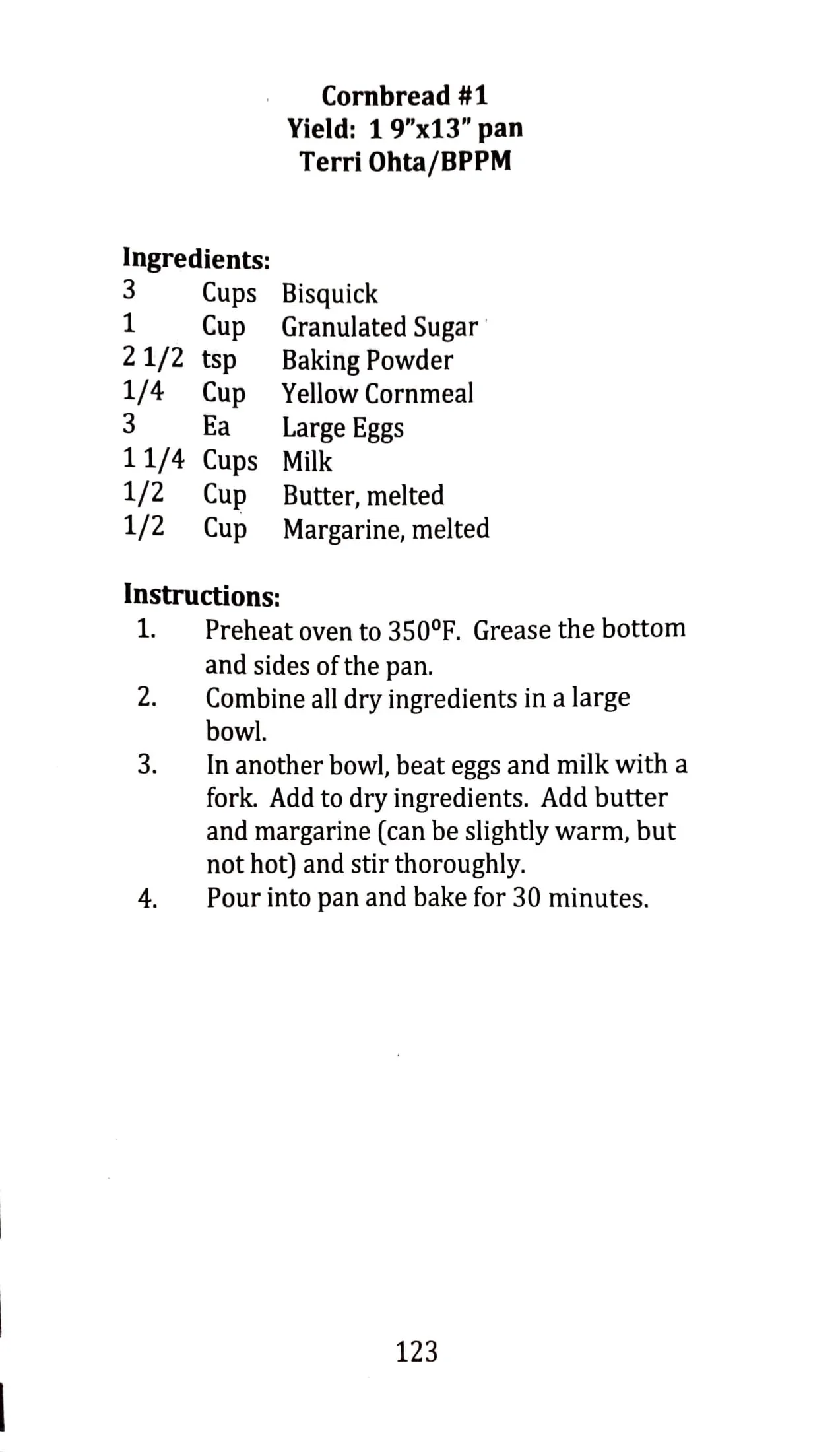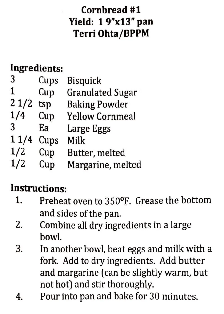 This recipe is good because it never fails. Besides, every one who tries it loves it, especially the HGEA staff. RECIPE: 2 C. Bisquick 1 C. sugar 2 T. cornmeal 1/2 t. salt 1 t. baking powder 2 eggs 1 C. milk 1 stick (4 oz.) butter, melted Mix dry ingredients together. Then add eggs,…