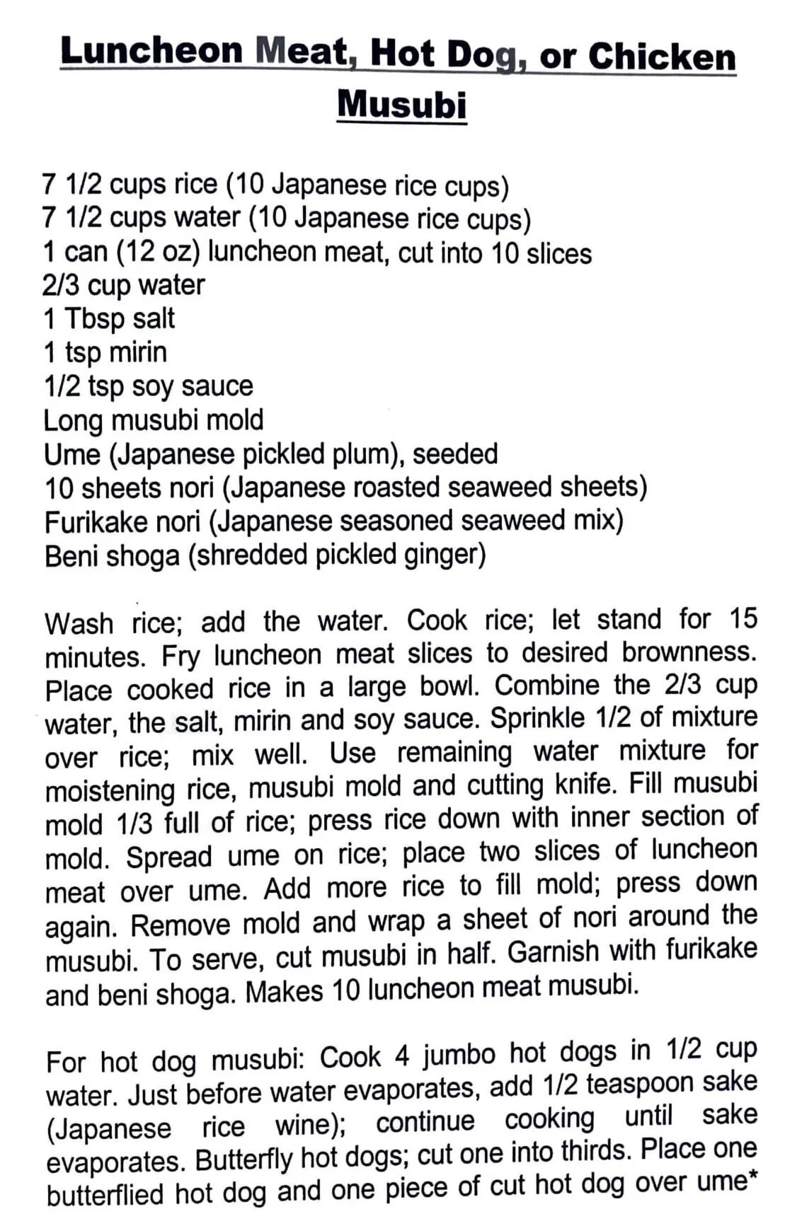 Luncheon Meat, Hot Dog, or Chicken Musubi
