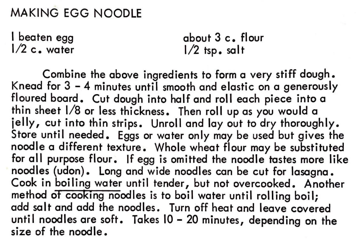 Combine the above ingredients to form a very stiff dough. Knead for 3 – 4 minutes until smooth and elastic on a generously floured board. Cut dough into half and roll each piece into a thin sheet 1/8 or less thickness. Then roll up as you would a jelly, cut into thin strips. Unroll and lay out to dry thoroughly. Store until needed. Eggs or water only may be used but gives the noodle a different texture. Whole wheat flour may be substituted for all purpose flour. If egg is omitted the noodle tastes more like noodles (udon). Long and wide noodles can be cut for lasagna. Cook in boiling water until tender, but not overcooked. Another method of cooking noodles is to boil water until rolling boil; add salt and add the noodles. Turn off heat and leave covered until noodles are soft. Takes 10 – 20 minutes, depending on the size of the noodle.