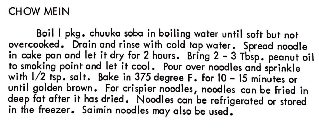 Boil 1 pkg. chuuka soba in boiling water until soft but not overcooked. Drain and rinse with cold tap water. Spread noodle in cake pan and let it try for 2 hours. Bring 2 – 3 Tbsp. peanut oil to smoking point and let it cool. Pour over noodles and sprinkle with 1/2 tsp. salt. Bake in 375 degree F. for 10 – 15 minutes or until golden brown. For crispier noodles, noodles can be fried in deep fat after it has dried. Noodles can be refrigerated or stored in the freezer. Saimin noodles may also be used.
